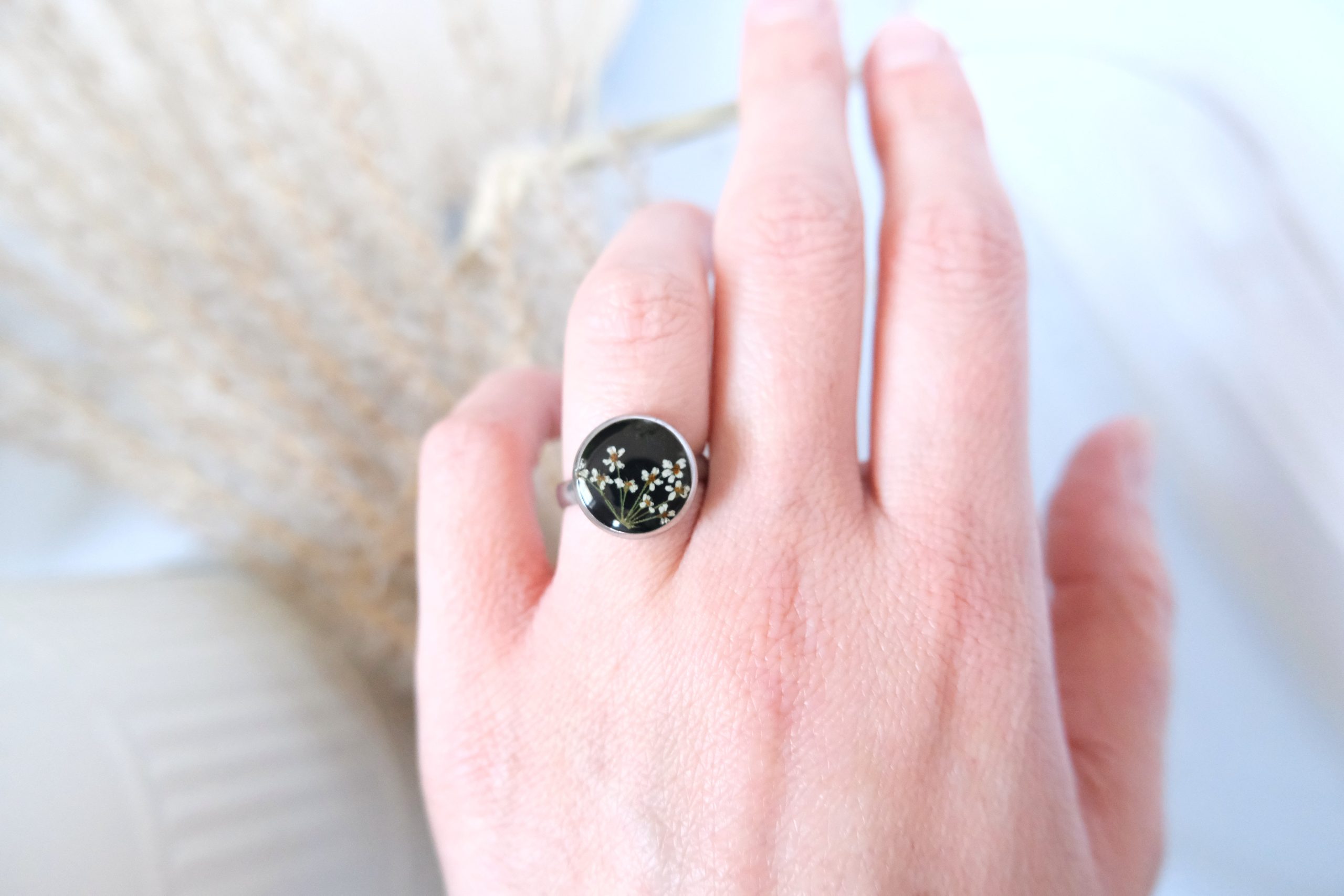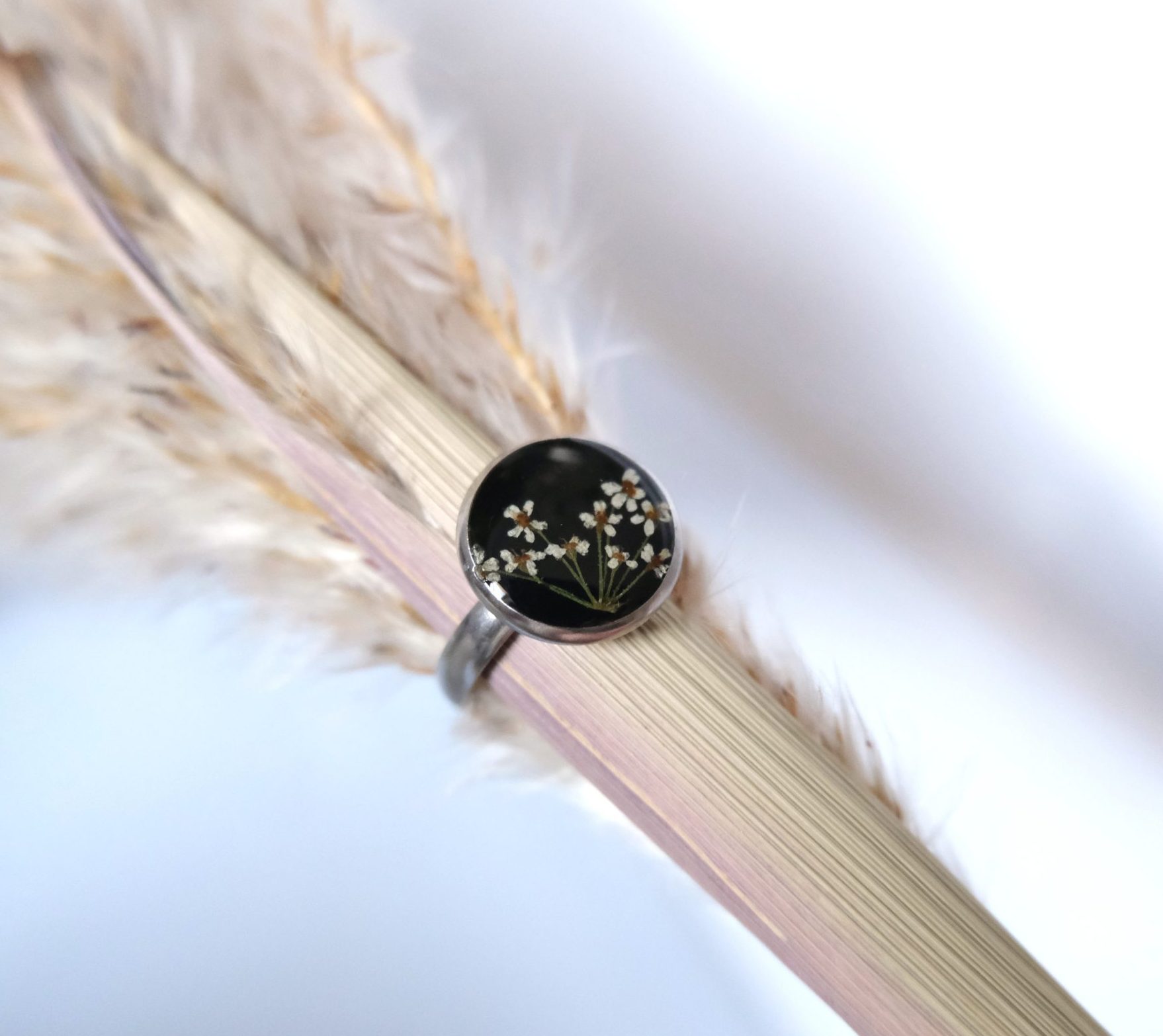 Materiał: hipoalergiczna stal szlachetna, żywica jubilerska, naturalne rośliny.