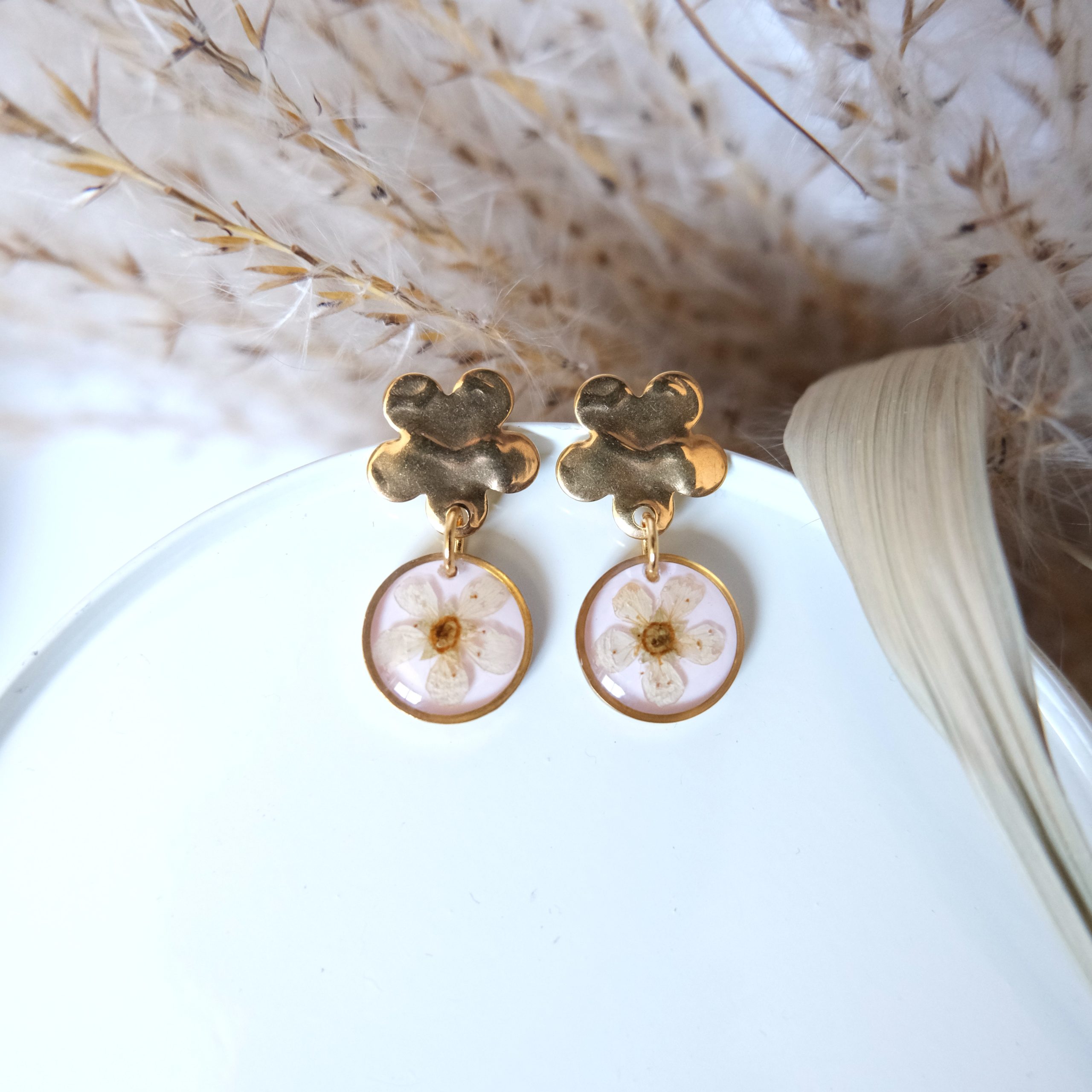 Materiał: hipoalergiczna stal szlachetna, żywica jubilerska, naturalne rośliny.